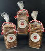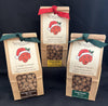 18 peanut butter bones stacked in a presentation-ready package tied with a candy-cane rope bow and our holiday-hat-wearing logo on the label. -